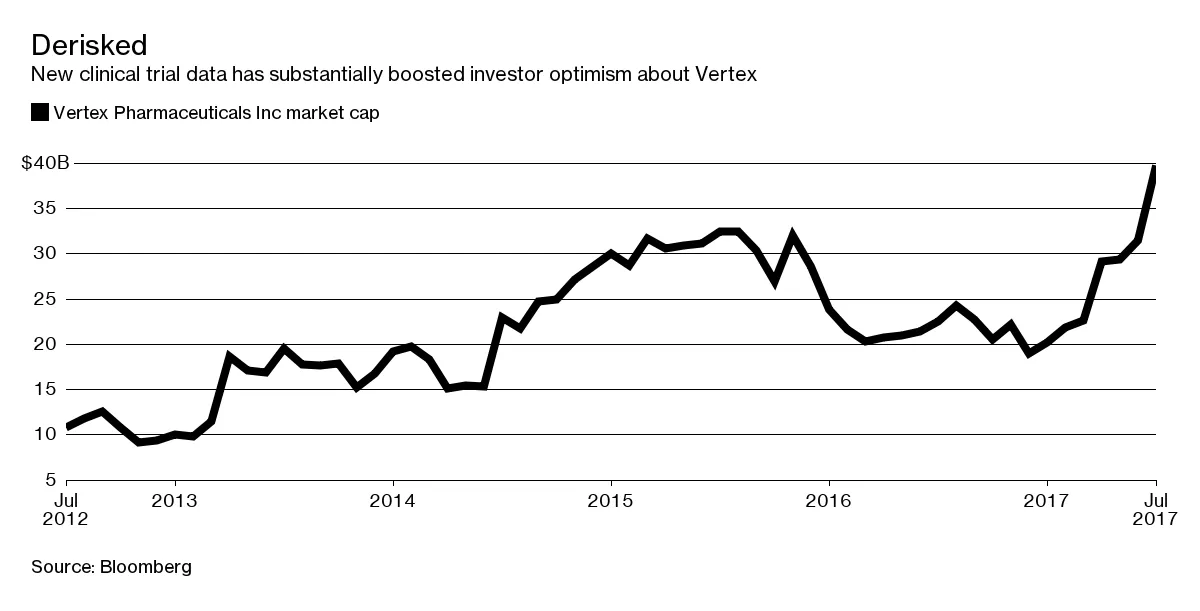 但Vertex制药公司本周接近于第二阶段的成功。这家制药公司在周二发布了来自针对最难治疗的囊性纤维化(CF)患者的三种药物组合的研究数据,结果比预期更好且更早。这些药物组合似乎显著改善了肺功能,并可能每年产生数十亿美元的销售额。