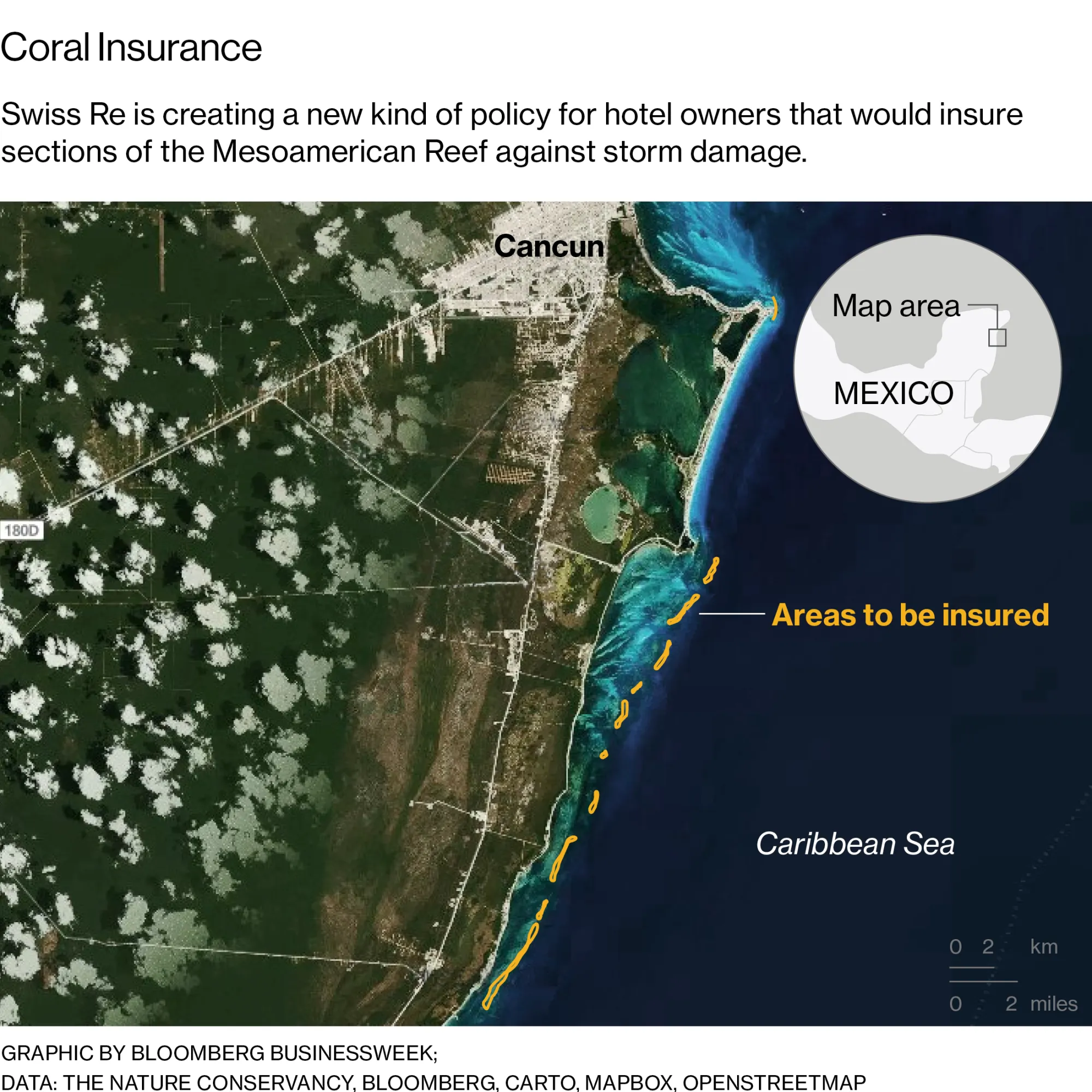 瑞士再保险公司正在为一段美索美洲礁准备一项保单。这可能是保险公司首次为自然结构提供保障。实际的保单持有者将是受到该礁保护的海滨酒店。到目前为止,维护该礁的责任落在墨西哥政府身上,由税收资金支持。瑞士再保险表示,其计划将为酒店业主在风暴后提供快速赔付,业主可以用这些资金修复海滩和礁石本身的损坏。这也将激励酒店业主保护该礁。“我们在这里开发的理论上是颠覆性的,”瑞士再保险全球合作伙伴关系高级副总裁亚历克斯·卡普兰说。“我真的希望这能创造一个新市场。”