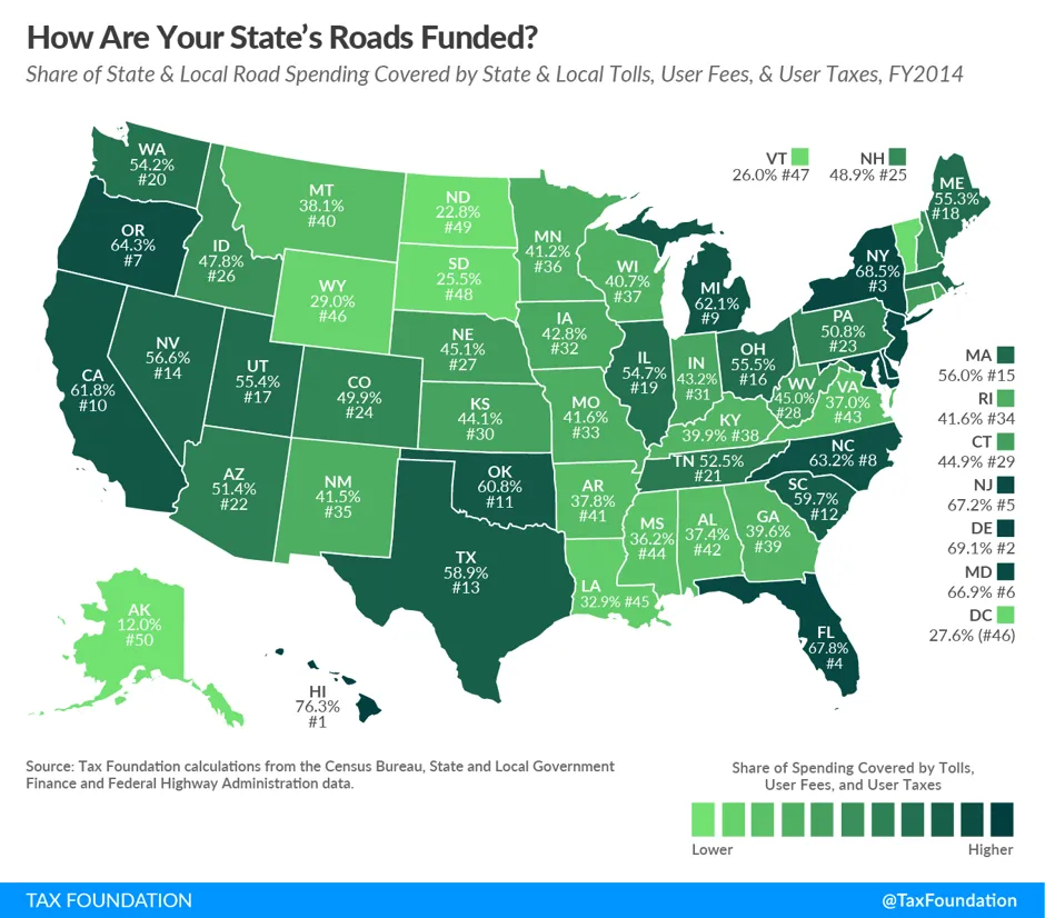 随着燃油效率高的车辆和通货膨胀的上升,联邦燃油税对美国交通支出的份额正在缩小。各州和城市如何弥补差额取决于你所在的位置。一个来自税收基金会的地图绘制并排名了本州境内本土高速公路收费、州燃油税以及车辆注册、车辆重量等用户费用如何为道路项目提供资金。