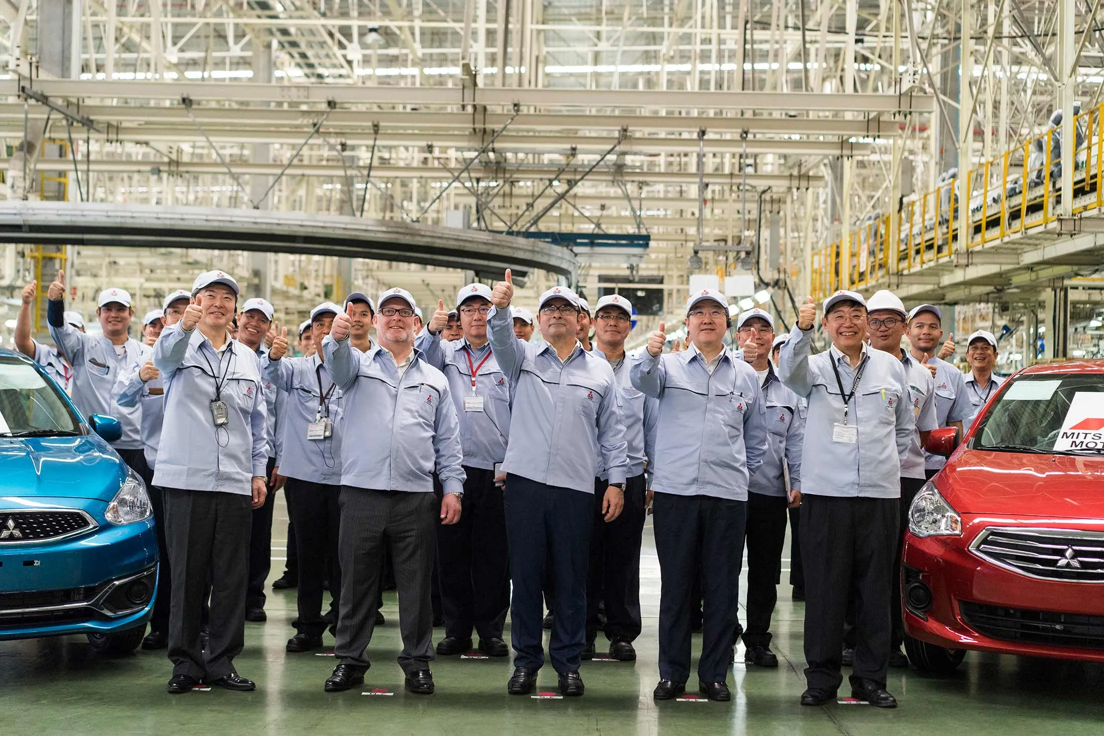 戈恩(中)与泰国三菱工厂的管理人员和工人合影。