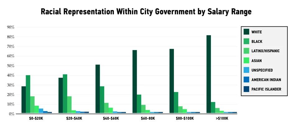 该市开发了一个 在线互动员工人口统计 应用程序,允许公众跟踪自2015年以来已经取得的进展(如下所示)。该市还推出了 CityScore 在线应用程序,允许公众跟踪和评估城市正在处理的其他公平和韧性问题。剩下的就是实施和执行,马丁对此充满信心,因为在这个种族平等韧性战略中已经建立了基础框架。
