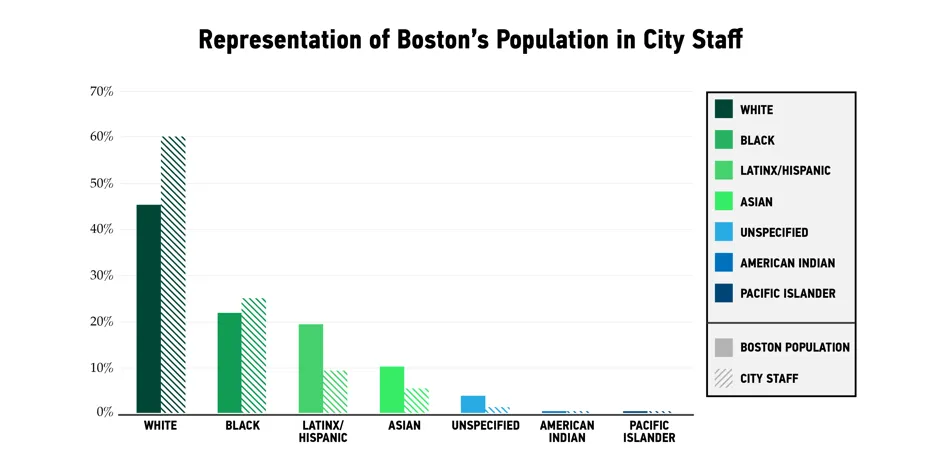 城市实验室;来源:“韧性波士顿:一个公平和互联的城市”无论薪水范围如何,拉丁裔和亚洲城市工作人员的收入始终远低于他们的白人和黑人同事。同时,拉丁裔是城市中增长最快的人口之一。与城市人口的比例相比,拉丁裔和亚洲人在城市工作人员中都被低估——这两个群体的比例差距高达一半。非裔美国人和白人城市工作人员的比例则相对过高。
