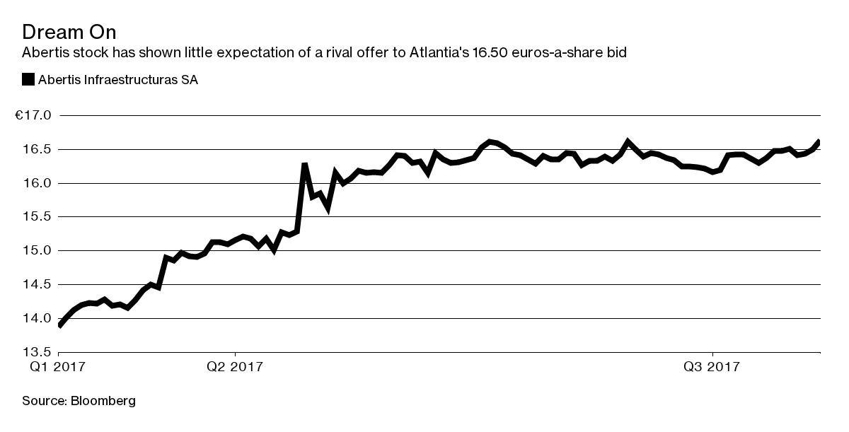 从财务上看,提出报价也将是一个挑战。确实,Hochtief的股票看起来是一个不错的收购货币。在过去两年中,由于对基础设施支出回升的期望,其股价已翻倍,现在的交易价格是预计收益的23倍。Abertis的股票交易价格大约是18倍。但大多数Abertis的投资者可能更倾向于现金。