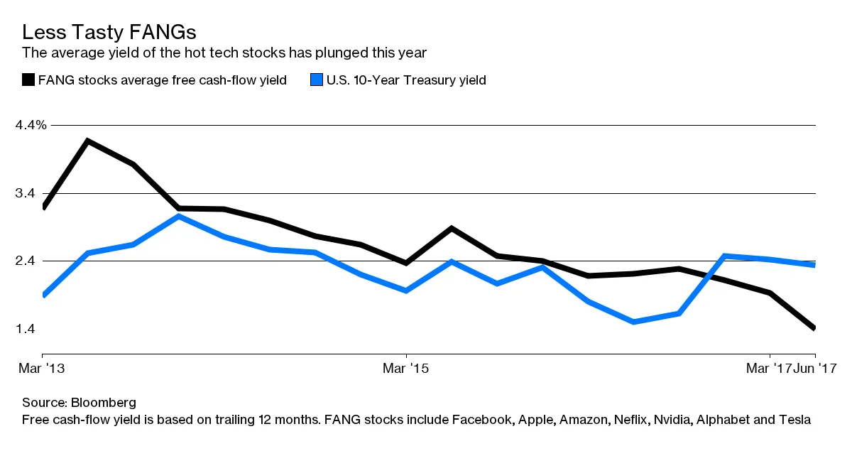 彭博社商业周刊没有被监禁的人。寻求庇护者占据了拜登承诺关闭的监狱美国正在用寻求庇护者填满臭名昭著的前监狱大学橄榄球需要向大联盟学习一课那些销售比职业选手更多棒球棒的网红兄弟们然而,随着投资者涌入FANG股票,投资者可以期待的回报指标却降到了新低。截至第二季度末,基于过去12个月的FANG股票平均自由现金流收益率仅为1.4%。这不到两年前该指标的一半,现在几乎比10年期国债的收益率低一个百分点。
