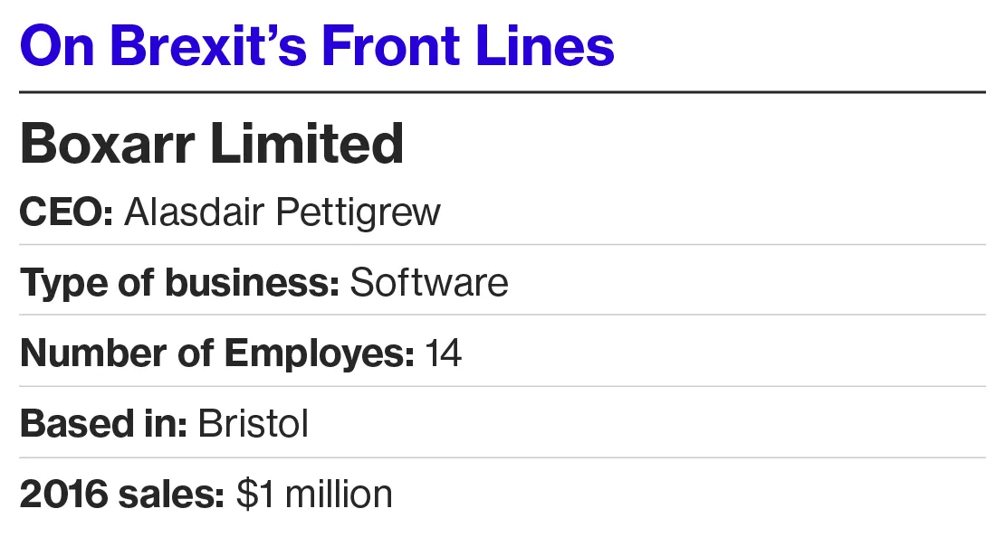 在脱欧前线: 阅读更多关于彭博社在脱欧期间关注的公司插图:卡米拉·帕金斯](https://www.outputnews.com/2017/bloomberg/news_2017_02_27_58403)尽管如此,佩蒂格鲁表示招聘进展顺利,Boxarr到目前为止过得不错,深化了与空客的关系,并首次进入汽车行业。他正在积极寻找美国客户,收入有望从去年的53万美元翻倍。公司还在寻求投资者的新资本以推动其增长。
