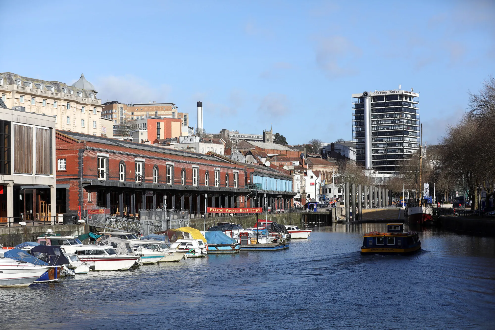 船只停靠在港口边,布里斯托尔的河渡船驶过。