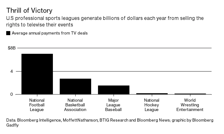 在美国,这些体育合同金额巨大。根据 证券文件,华特迪士尼公司在未来几年将支付490亿美元用于在ESPN及其其他电视网络上播出的体育赛事。福克斯母公司21世纪福克斯公司在电视体育合同下的欠款总额为570亿美元,而较小的CBS公司则为81亿美元,该公司播出NFL比赛和NCAA大学篮球锦标赛。BTIG研究分析师布兰登·罗斯曾 表示终极格斗冠军赛可能在下一个电视合同中要求每年超过4亿美元的费用用于综合格斗比赛。