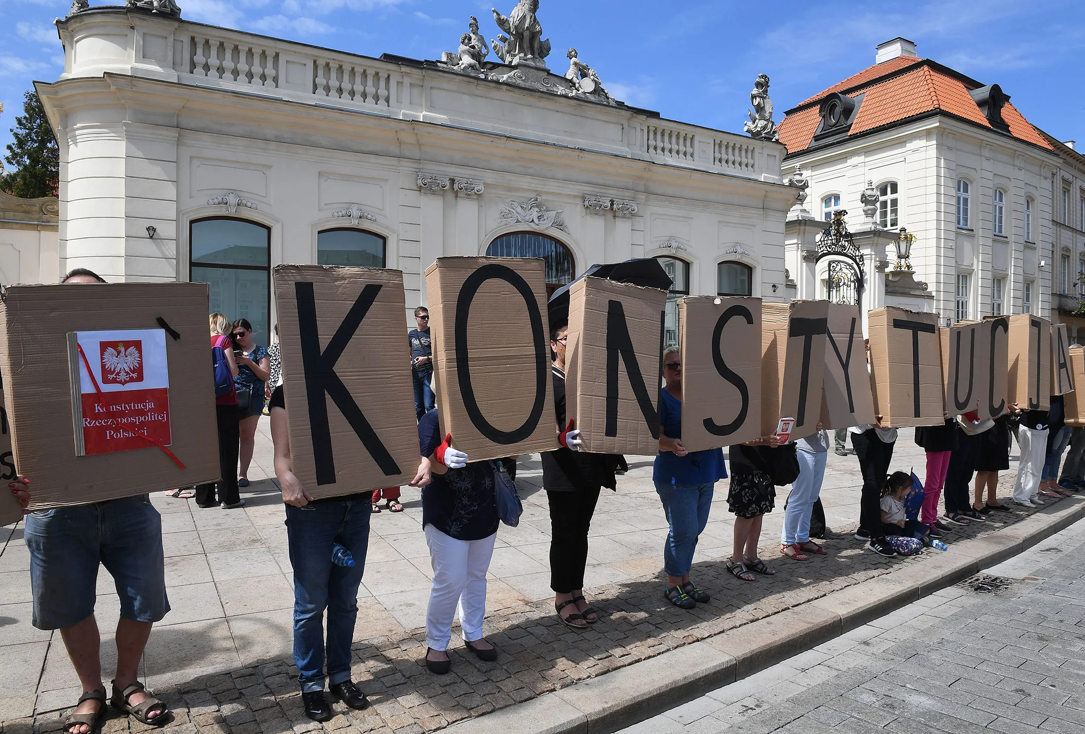 人们在华沙总统府前示威,波兰总统发表声明宣布他将否决有争议的司法改革。摄影师:雅内克·斯卡尔津斯基(JANEK SKARZYNSKI)/法新社表面上,杜达(Duda),45岁,似乎在对抗政府,但他是一个忠于党的成员。他是法律与公正党领导人雅罗斯瓦夫·卡钦斯基(Jaroslaw Kaczynski),68岁,提名的总统,他的竞选由比阿塔·希德洛(Beata Szydlo),54岁,管理。2015年10月大选获胜后,她被任命为总理。