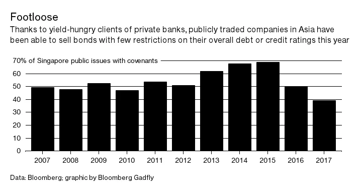 在2017年新加坡由上市亚洲公司发行的82个债券中,只有39%包含借款人限制杠杆的承诺。在过去七年中,首次出现大多数企业在这个城市国家出售所谓的轻契约债务。这很奇怪,因为根据彭博新闻Denise Wee周二的报告,新加坡的富人遭受了前所未有的13.5亿新元(9.92亿美元)的本地票据违约。许多人陷入损失,因为重组拖延。