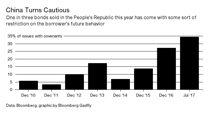 将这种热情与中国进行对比,几年前限制性契约几乎不存在,因为没有任何违约情况。(即使现在,60%的1,500家上市公司债券由国家四大本地机构评级为AAA。)尽管如此,巨大的企业债务负担意味着中国投资者仍然谨慎。今年每三家大陆发行的债券中就有一家附带契约,六年来增长了10倍。