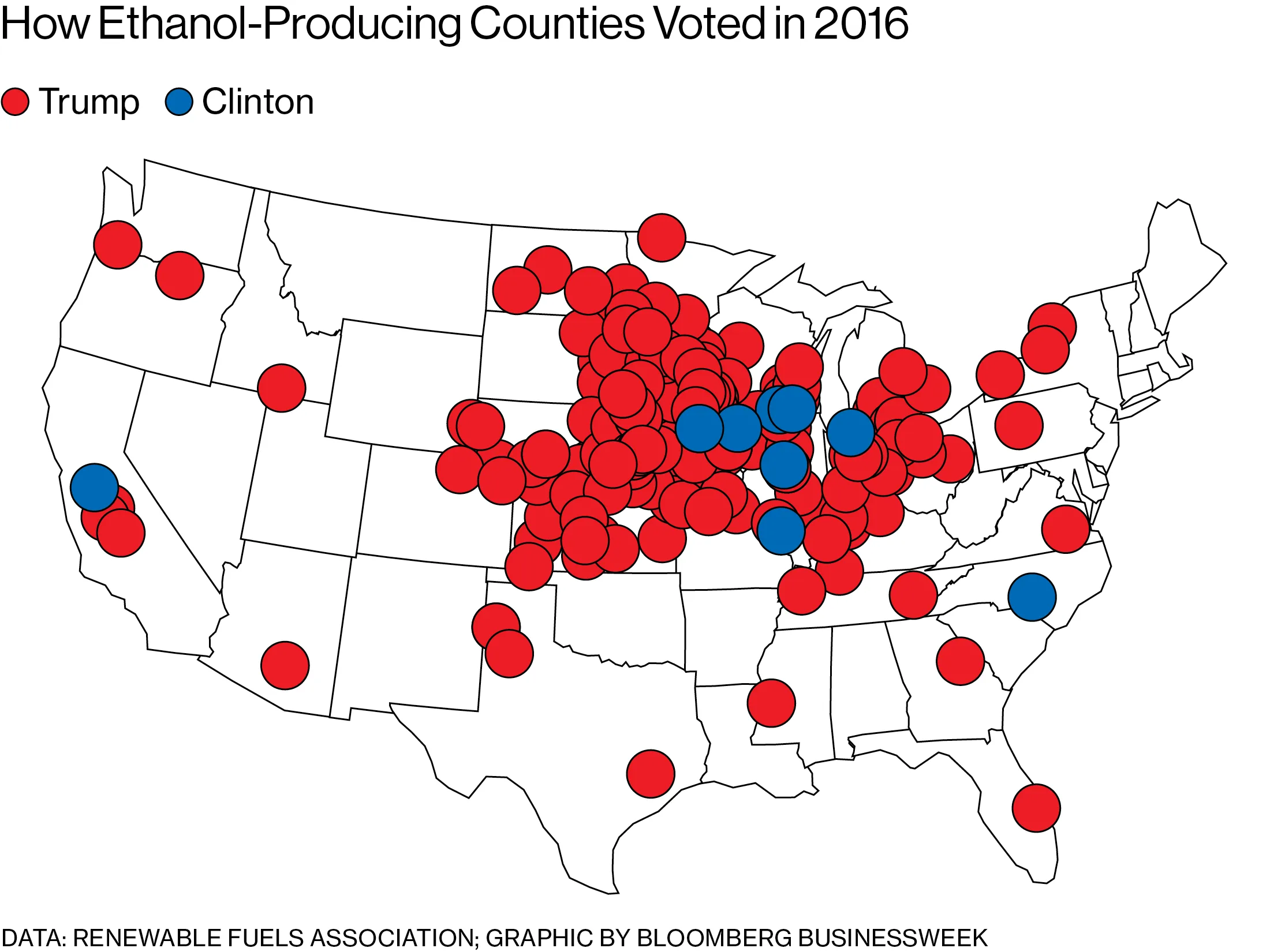 插图:Tomi Um 为彭博商业周刊创作作为总统候选人,唐纳德·特朗普花了很多时间迎合乙醇行业,走访其位于中西部的农村基地,并多次表达对玉米和大豆制成的生物燃料的支持。根据 可再生燃料协会 汇编的数据,11月他得到了回报:在美国184个拥有乙醇厂的县中,95%的人投票支持特朗普。