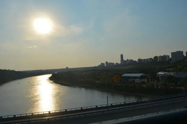 从高水平街桥俯瞰北萨斯喀彻温河,时间大约是晚上8点。安德鲁·斯莫尔/城市实验室凭借其 临时彩虹人行道,怀特大道可能是埃德蒙顿最近地方营造努力中最显眼的标志。一个 新的市中心保护自行车道网络 刚刚完成建设。人行道延伸到酒吧和餐馆前的街道上,重新占用道路空间。太阳能货运自行车为市员工提供 浇灌花坛,可爱的加拿大卡通 宣传长椅 使城市成为各背景人群的聚集地。