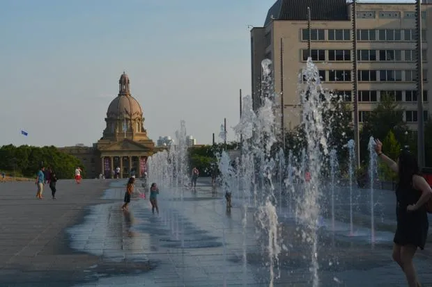 喷泉欢迎人们来到阿尔伯塔省首府大楼北侧的广场。安德鲁·斯莫尔/城市实验室埃德蒙顿的市中心距离哈比塔特社区约十英里,拥有高层公寓和公寓,受到过去二十年石油砂热潮带来的收入涌入的推动。建筑风格的混合——早20世纪的平头砖建筑、1970年代风格的粗野主义建筑和明显现代主义的玻璃塔——显示了经济繁荣的时期,以及由此推断出的经济低迷的时期。“埃德蒙顿传统上是一个蓝领工业社区,”罗斯说。“但[这座城市]的经济非常多元化——大约25%的埃德蒙顿工作岗位在医疗、教育或公共管理领域。”这种多样性在一定程度上使埃德蒙顿免受商品价格下跌的经济影响,相较于其他阿尔伯塔城市如卡尔加里或红鹿市。