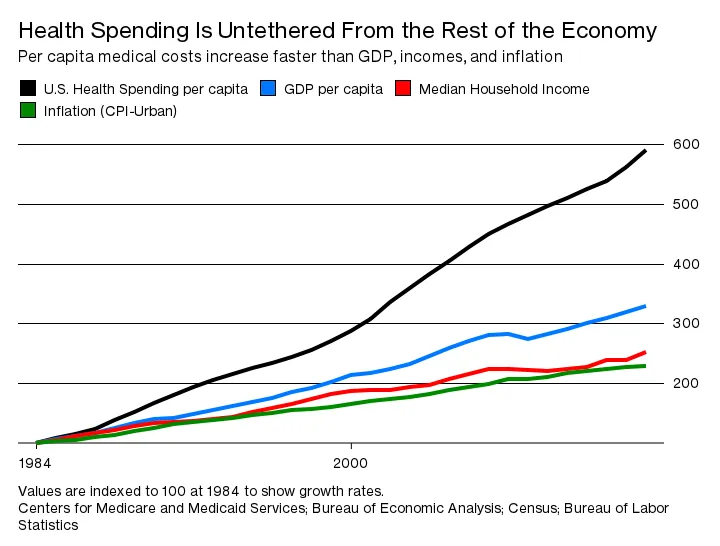 插图:Kurt Woerpel 为《彭博商业周刊》绘制无论华盛顿的 平价医疗法案发生什么,其他美国人将面临一个他们几十年来一直存在的问题:医疗支出以不可持续的速度增长。保险和医疗费用正在侵蚀中产阶级的收入——数千万收入过高而无法获得政府补贴的覆盖,但又不至于不感受到医疗账单的压力的人——而国会的议程上没有任何内容可能解决这个问题。