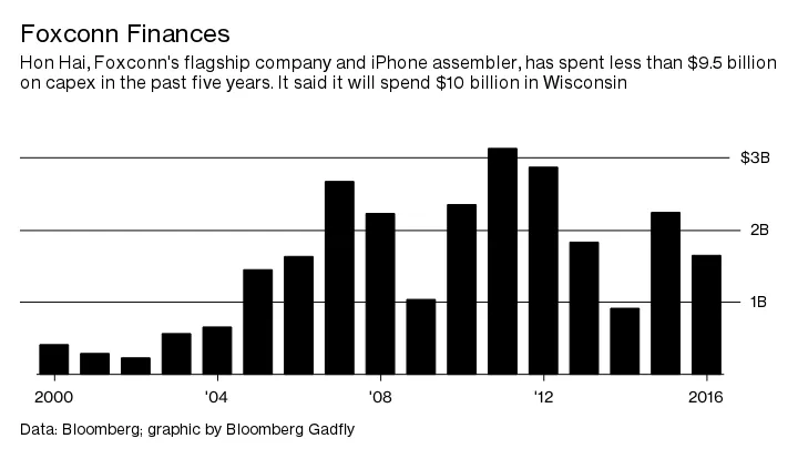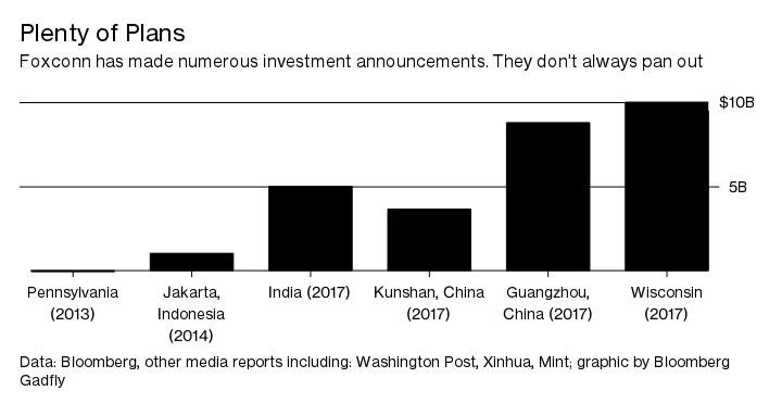 就在过去的一年里,富士康据报道承诺在 印度投资50亿美元;在 昆山,中国投资36.5亿美元;在 广州投资88亿美元。现在还为时已晚,无法确定这些资金是否会被花费,但包括威斯康星州在内,目前的承诺总额已达到275亿美元。这比鸿海在过去23年中花费的还要多。