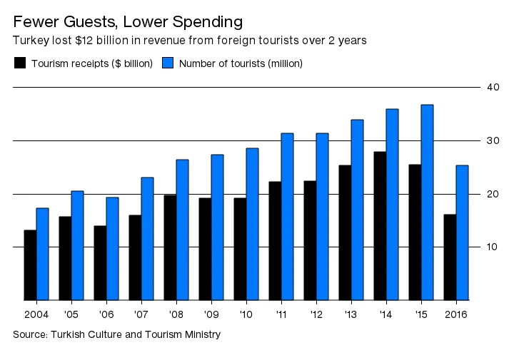 作为接受难民的交换,土耳其将从欧盟获得总计60亿欧元(70亿美元),到2018年,这使得土耳其不愿意放弃其交易的一方。此外,去年前往土耳其的外国游客人数减少了超过1000万;今年前五个月,德国游客的访问量下降了25%,德国游客通常是访问土耳其的最大旅游团体之一。