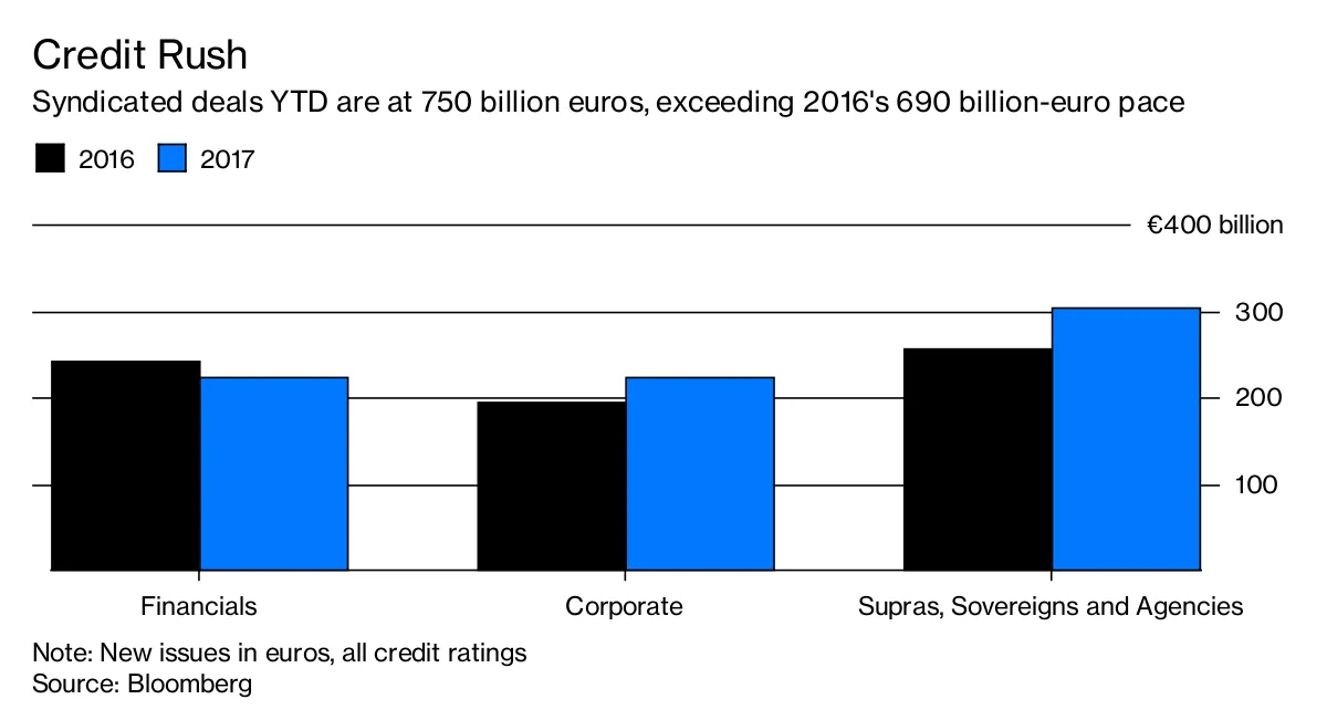 根据彭博社的 调查,更广泛的层面上也将出现下降。2015年和2016年八月的欧元、英镑和美元交易特别繁忙,完成了约500亿欧元的发行。今年达到这一水平似乎有些困难。