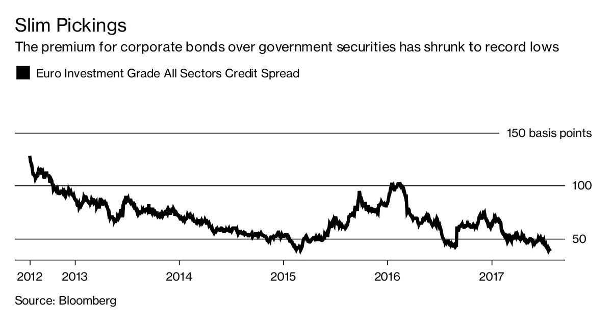 需求的一个主要驱动因素,欧洲中央银行的公司债券购买计划,可能即将消失。随着信用利差降至历史低点,投资者感到低利率疲劳的迹象越来越明显。