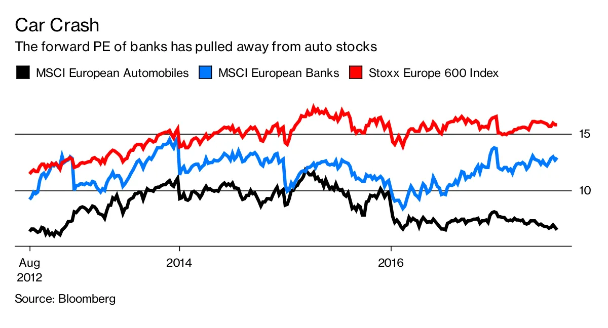 这种估值差距部分反映了马尔基奥内提到的那些受批评银行的更好表现。德意志银行及其同行的股票在最近几个月重新定价,原因是欧元区经济改善、对放松监管的预期以及改善资本基础的措施。这就引出了一个问题:汽车制造商可以做些什么来提高他们的市场价值?