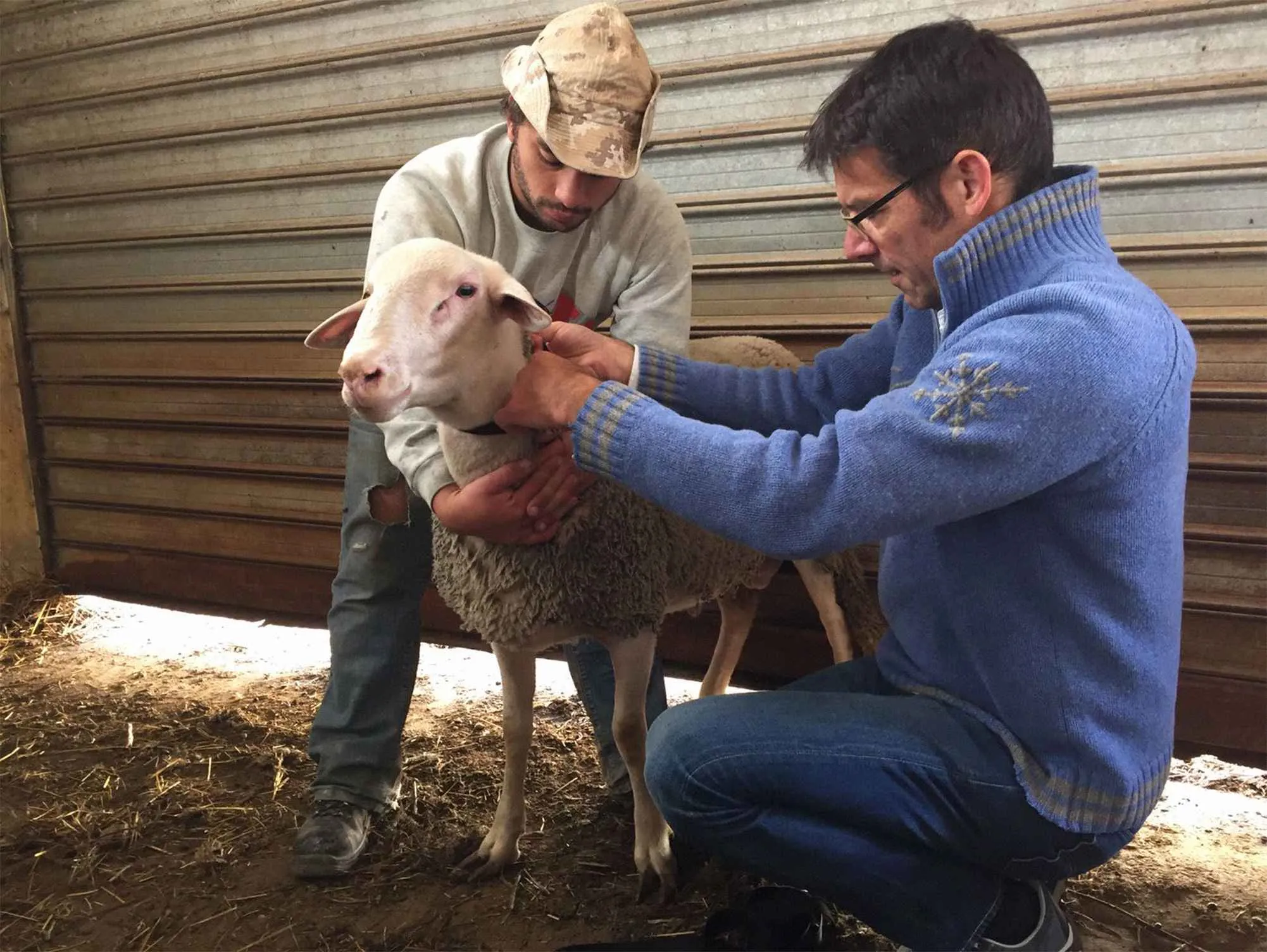 马丁 维克尔斯基(右),马克斯·普朗克鸟类研究所的迁徙专家,为一只羊安装传感器标签。