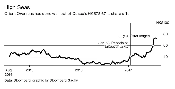 如果张能够为这样的移交铺平道路,他将获得很多好处。中远海运在收购中对东方海外(国际)有限公司的前一交易价格提供了近三分之一的溢价——在那种情况下,控股股东是特区亲北京的前首席执行官董建华的家族。