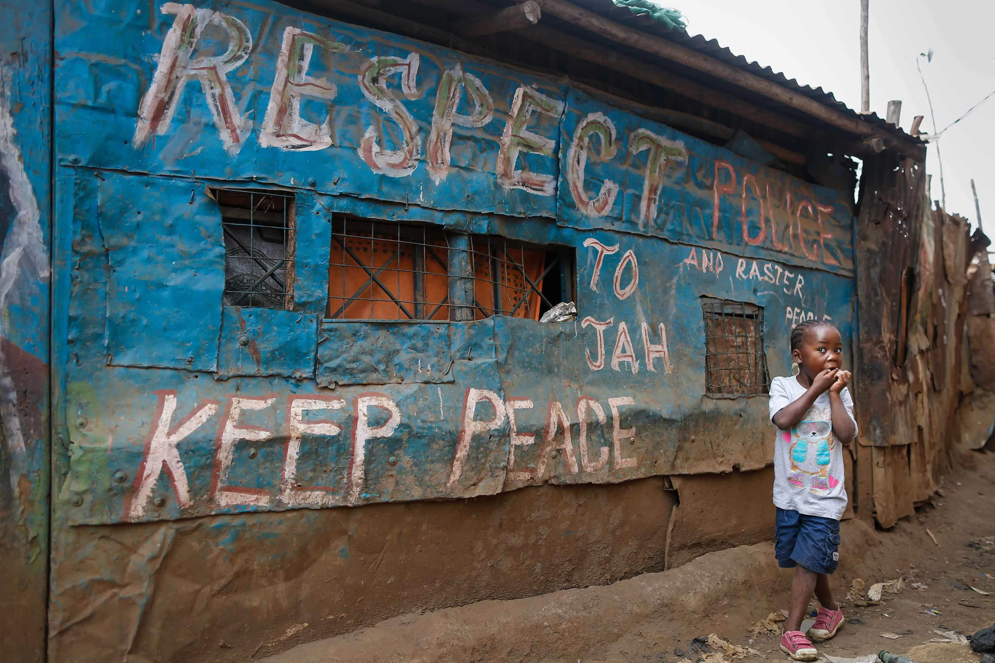 一名女孩走在涂有标语的酒吧前,背景是2007-08年肯尼亚的全国大选。
