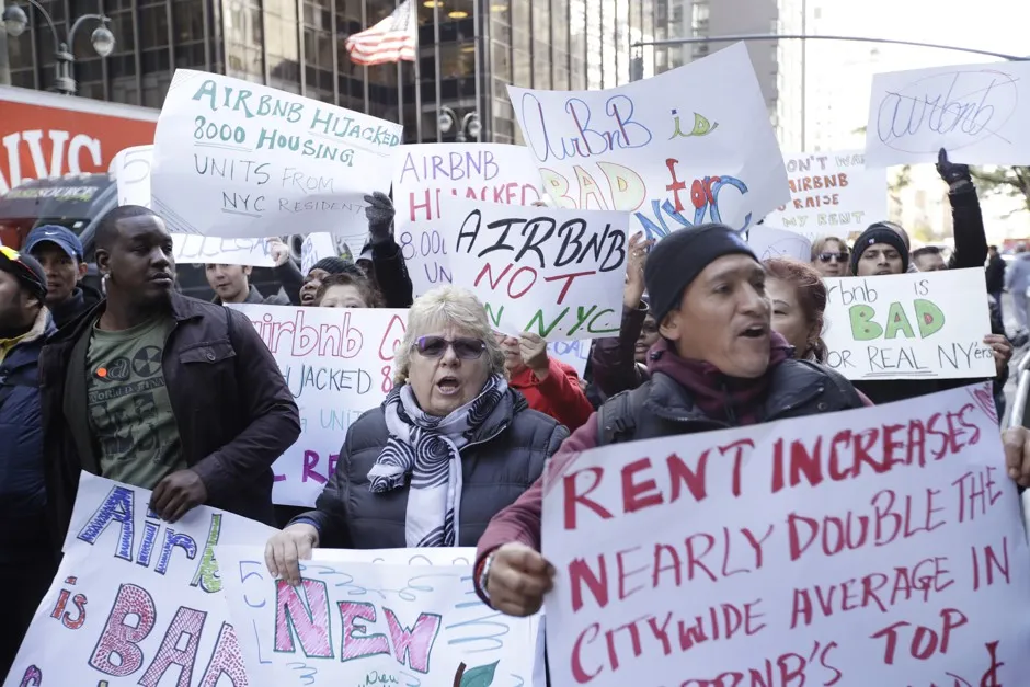 抗议者于2016年10月26日星期三聚集在纽约州州长安德鲁·库莫的办公室外,地点在第三大道。科技领袖和数百名Airbnb房东聚集在库莫的办公室外,呼吁制定“公平”的共享住房法律。美联社照片/弗兰克·富兰克林二世监管机构担心Airbnb正在侵蚀可负担住房的可用性,现在有了一项新的证据:一项 新研究发现,Airbnb房源的激增与美国一些最大城市地区的租金上涨有着密切的联系。