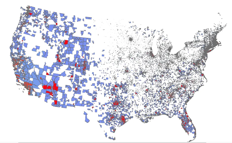 美国各县细分区域的创新率贝尔克斯与盖塔尼上面的地图显示了美国各地产生专利的地方。红色聚集区表示持续创新的地方;蓝色表示偶尔产生专利的地方;而地图上的空白区域代表在研究期间没有产生任何专利的地方。
