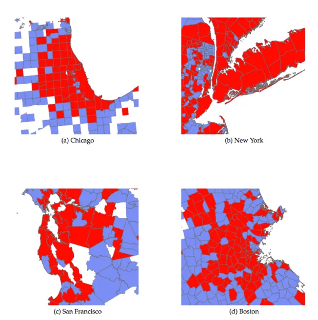 请查看下面关于纽约、旧金山、波士顿和芝加哥及其周边地区的专利活动地图(颜色与上面的全国地图相同)。在每种情况下,几乎所有高密度城市地区都被标记为持续创新,周围的大多数郊区也是如此。事实上,持续创新的郊区地区数量大大超过城市地区。