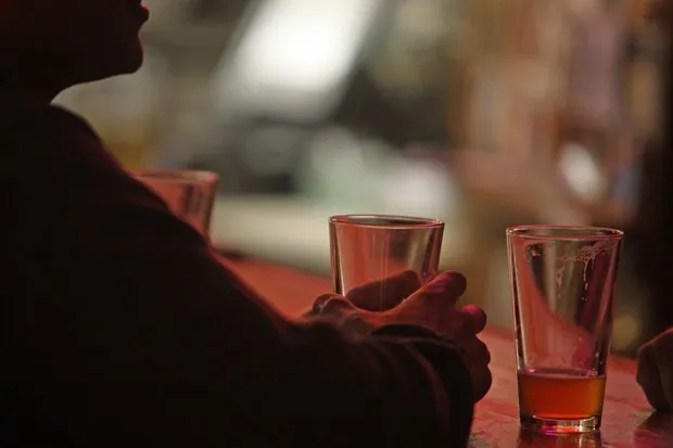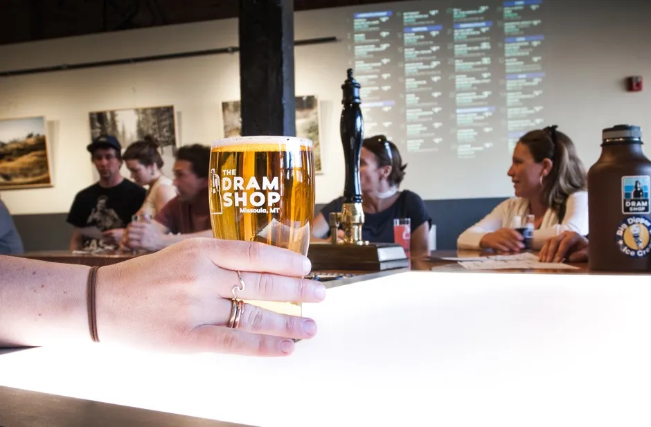 米苏拉的酒吧“Dram Shop”的顾客,这是这座城市众多本地酿造饮品的场所之一。迈克尔·海伍德在蒙大拿州米苏拉的一个最近的晚上,尼克·穆诺斯和来自犹他州洛根的两个朋友站在一个叫做Dram Shop的酒吧里,绝望地思考着投影在墙上的丰富啤酒单。
