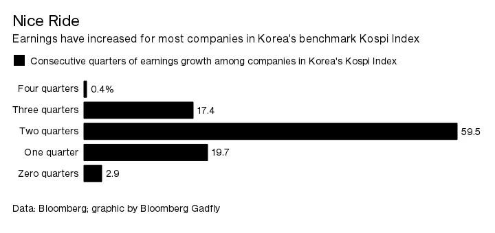 但现在,收益相当健康:根据彭博社编制的数据,Kospi指数上超过一半的公司在本季度报告中显示利润增长或缩小亏损。