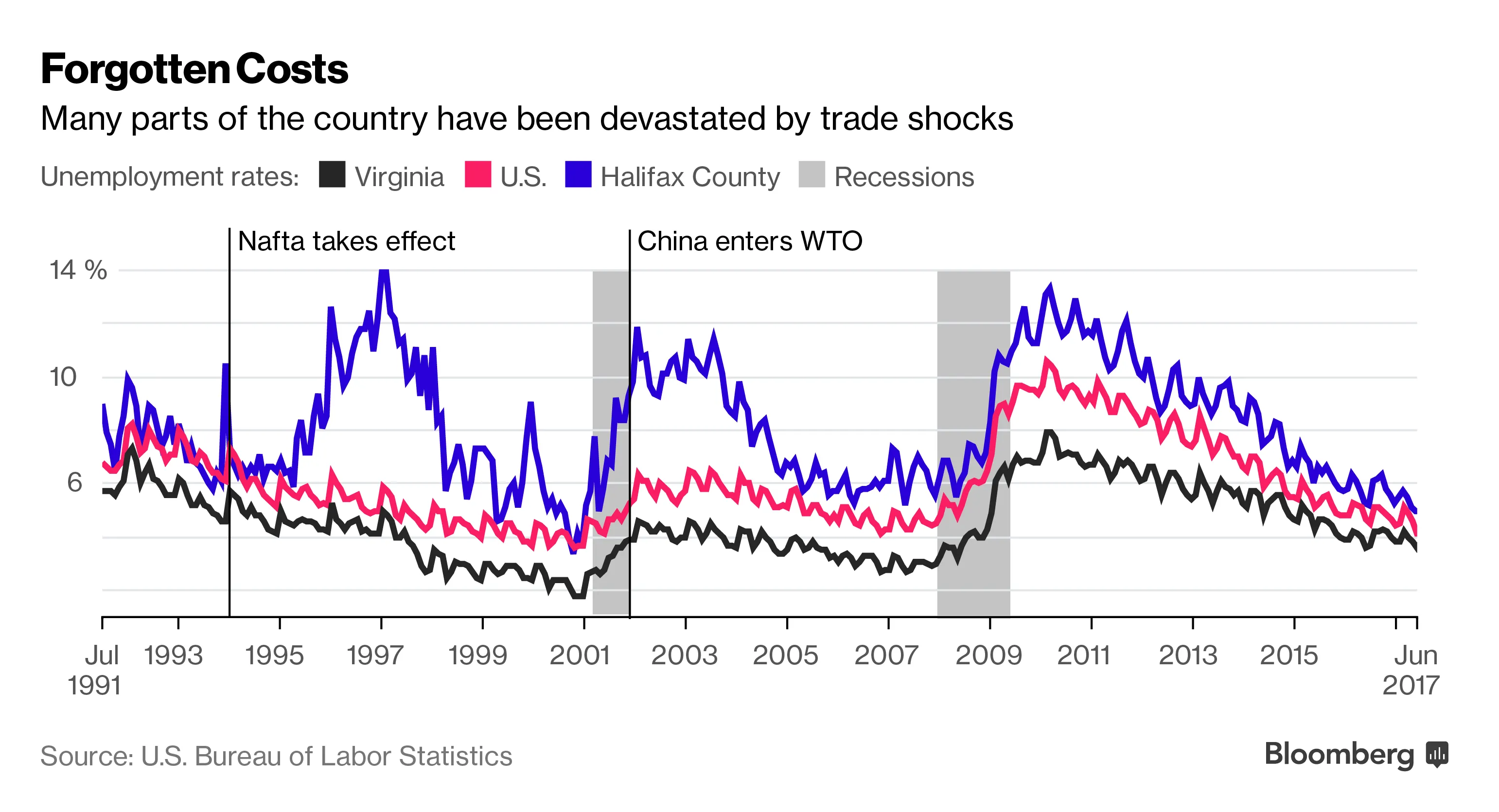 在1994年北美自由贸易协定生效后的几年里,哈利法克斯县的工作岗位被摧毁。尽管全国失业率趋向三十年来的低点,但哈利法克斯县的失业率飙升至13.9%。几年前,中国加入世贸组织后,这一模式再次出现。