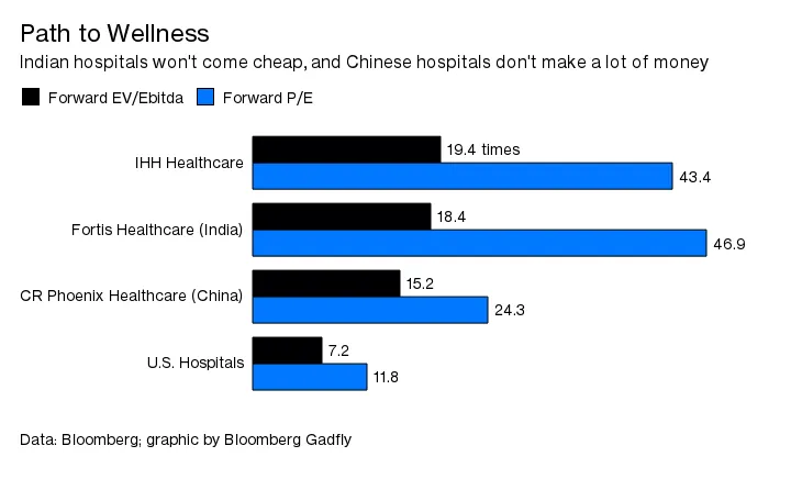 印度的Fortis Healthcare Ltd.在印度、迪拜、毛里求斯和斯里兰卡拥有45家设施和300多个诊断中心,曾热衷于将资产出售给IHH。然而,这家马来西亚医院运营商在6月退出交易,因为它担心一些资产可能会被大冢制药公司夺走,此前这家日本制药公司在与Fortis的所有者的诉讼中胜诉。即使谈判恢复,Fortis也不会便宜。它的交易价格已经达到企业价值/息税折旧摊销前利润的18倍,接近IHH自己的19倍。