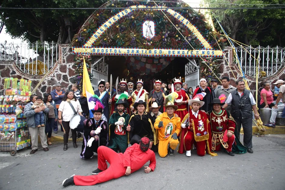 圣地亚哥人,一个传统的表演乐队,在阿卡华尔特佩克教堂庆祝圣地亚哥使徒时摆姿势。古斯塔沃·格拉夫雷米利奥·巴尔加斯,83岁,被认为是墨西哥城最大区伊斯塔帕拉帕的圣玛尔塔·阿卡蒂特拉的族长。他保留着他的土坯房屋,以提醒自己这个村庄曾经的模样,在成为混凝土海洋中的一个点之前。