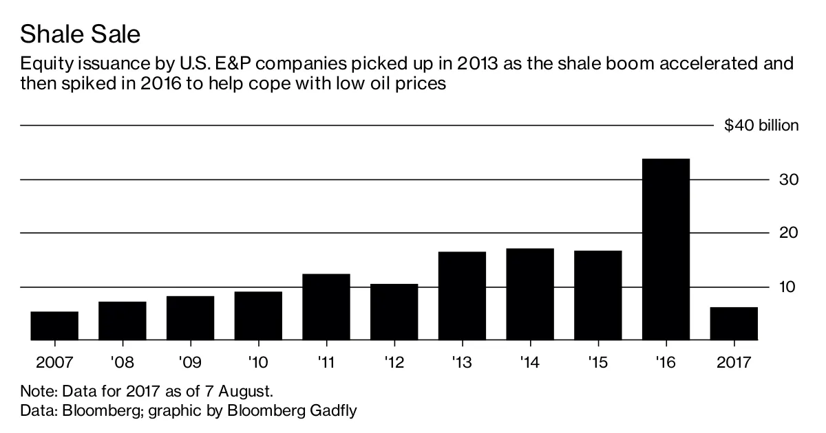 2017年的股票发行已减缓至几乎停滞;按年化计算,迄今为止的总额暗示今年整体低于100亿美元,这将是自2010年以来的最低水平。部分原因是2016年底OPEC引发的油价反弹帮助E&P公司对今年的生产进行了大量对冲,使它们能够在不依赖股市的情况下资助钻探预算。