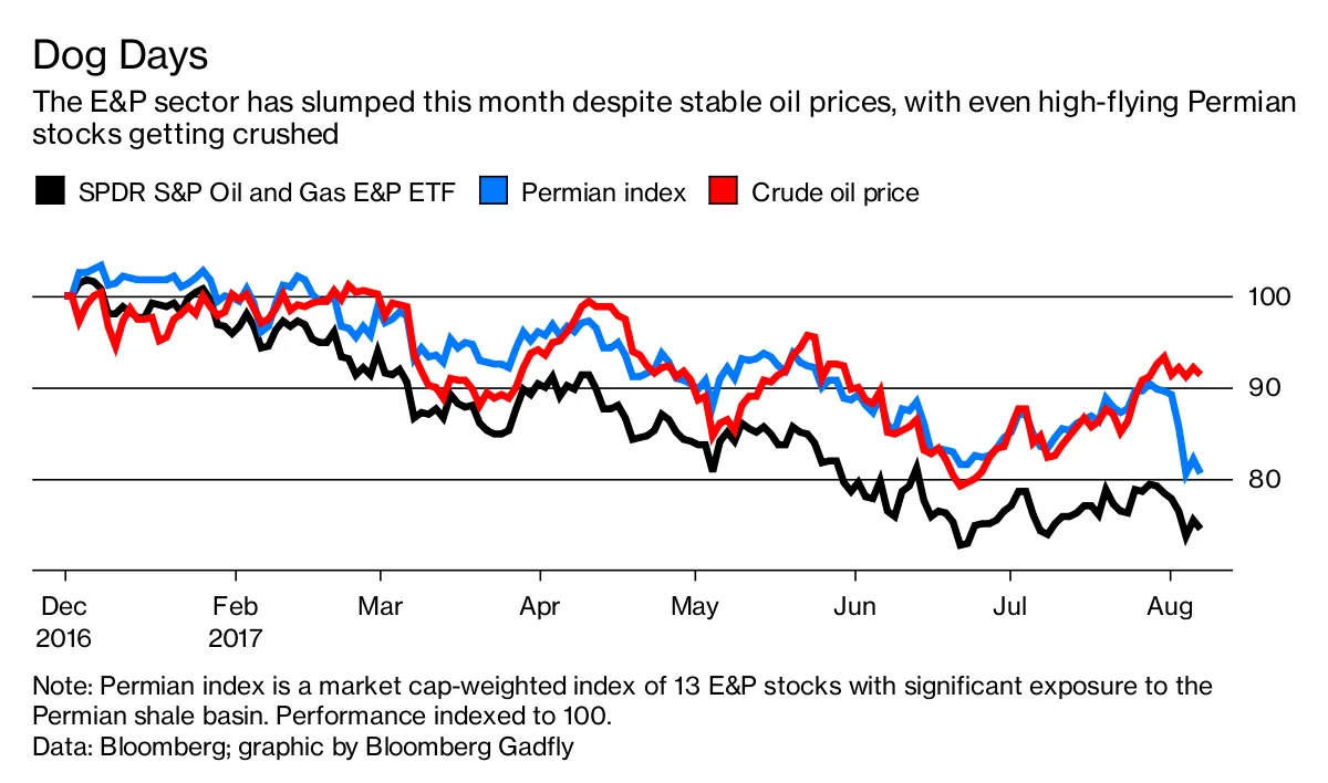 摄影师:斯宾塞·普拉特在过去一周,勇敢的页岩行业遭遇了现实的考验。油价与8月初相比并没有太大变化,但勘探和生产公司的股票,尤其是二叠纪盆地的宠儿,夏季却一路下滑: