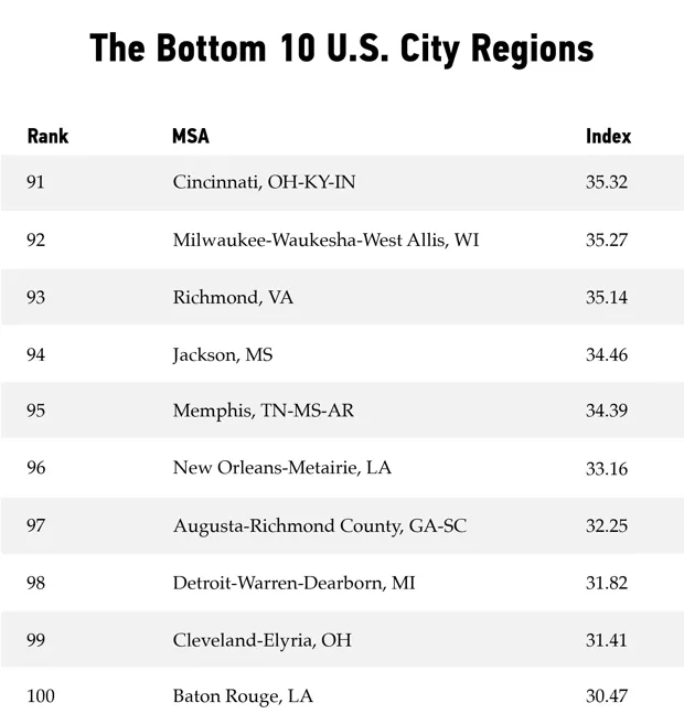 1. 沿海地区在整体排名中始终位居最高,前十名中有六个地区位于西海岸。 圣荷西-阳光谷-圣克拉拉大都市区在指数中位居首位,得分为61.04。圣荷西是美国第十大人口城市,部分通过与其强大的科技部门合作,开创了环境可持续性,并在创建合作伙伴关系以实现目标的城市中获得了最高排名。