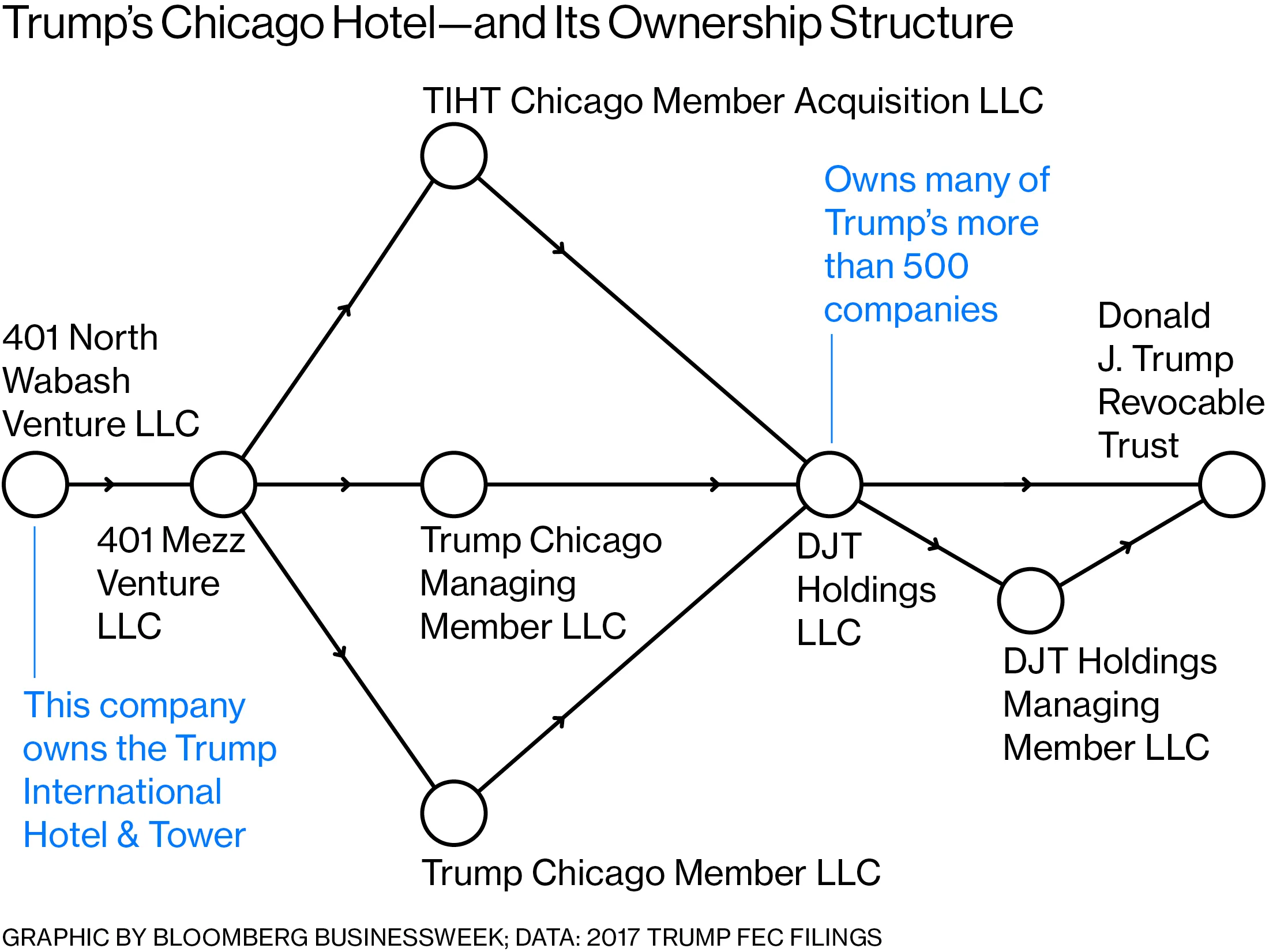 一家公司拥有该建筑,然后另一家公司拥有该所有者——接着还有三家公司拥有该所有者的所有者,根据特朗普总统最新的 联邦财务披露。其他公司似乎负责特定任务,管理建筑的商业、住宅和酒店业务。然后还有一些公司拥有这些公司。最终的归属是唐纳德·J·特朗普可撤销信托,该信托为总统的全球业务收取收入以供其受益。税务律师罗纳德·维纳表示,这一结构的流程图“将从舞厅的天花板延伸到地板”。