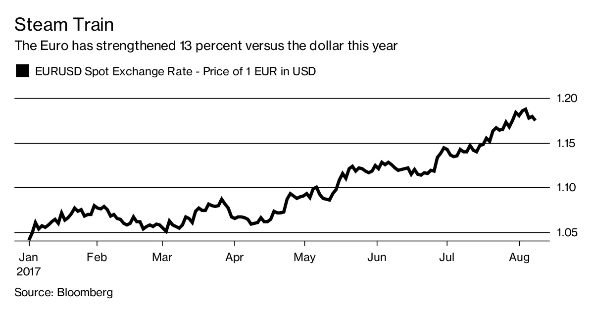 总统唐纳德·特朗普的政治困难,包括推进其经济议程的延迟,正在削弱美元在许多货币中的表现,但在对欧元的表现上尤为明显。这部分是由于该地区更好的增长率,但也因为欧洲央行必须在其量化宽松计划在年底到期之前做出削减刺激的决定。