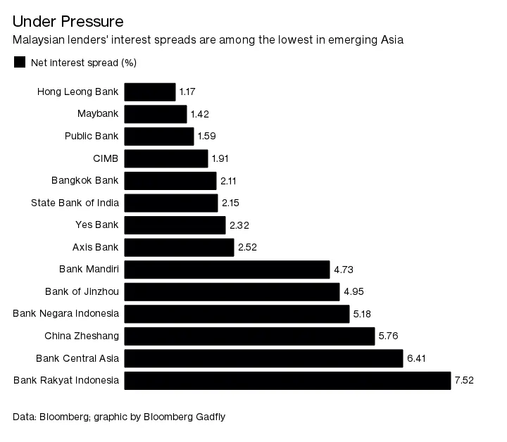彭博社商业周刊没有被监禁的人。寻求庇护者占据了拜登承诺关闭的监狱美国正在用寻求庇护者填满臭名昭著的前监狱大学橄榄球需要向大联盟学习一课影响者兄弟销售的棒球棒比专业人士还多大型马来西亚银行——马来亚银行、公共银行有限公司、CIMB和丰隆银行——现在的净利差低于2%,这使它们成为新兴亚洲最不盈利的贷款机构之一。(不过,净利 margin健康,达到2.43%,比一年前高出9个基点,马来亚银行的新闻稿引用首席财务官阿米鲁尔·费萨尔·万·扎希的话说。)