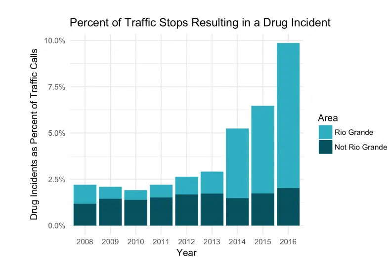 Sorenson报告支持了警方在该地区进行有针对性的执法的理论。Rio Grande的毒品事件——响应、拦截、查获和逮捕——在城市总事件中占据了显著更高的比例(下图第一张)。而由于交通拦截而导致的事件,自2014年以来每年也出现了巨大的增长(下图第二张)。