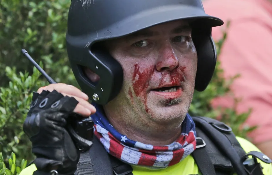 一名白人民族主义示威者,在与反示威者发生冲突后满身是血,位于弗吉尼亚州夏洛茨维尔的解放公园入口处。史蒂夫·赫尔伯/AP越来越多的市长发表声明,谴责驱动“团结右派”白人至上主义集会在弗吉尼亚州夏洛茨维尔引发暴力和死亡的种族主义。