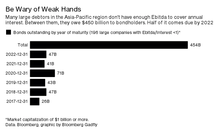 不过,问题在于来自无评级债券世界的那种溅水声。1502695030493 两年前,该地区大约4200家上市公司没有赚取足够的营业利润来支付利息。这个数字已经微增至4400家。其中,200家公司——大部分是中国公司——的市值超过10亿美元。在这200家公司之间,它们欠债券投资者4500亿美元。这笔金额的一半必须在现在到2022年之间进行再融资或赎回。