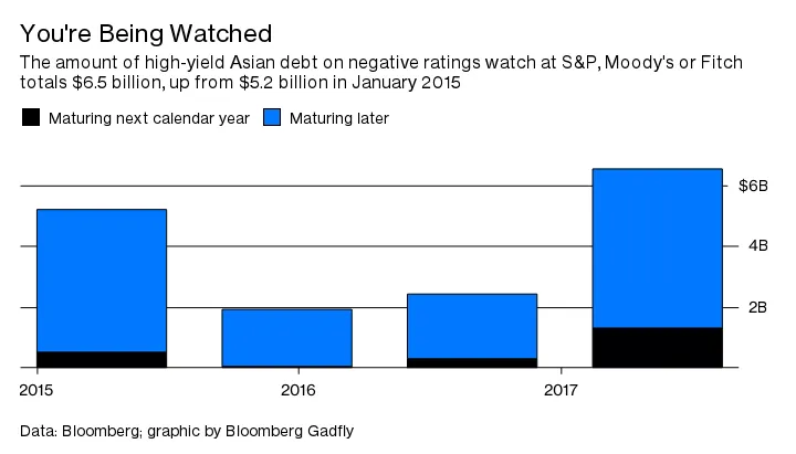 在2015年初,正当商品崩溃开始时,亚太地区有13只投资级以下的债券在三大评级公司中的任何一家都处于负面评级观察中,包括来自中国开发商凯撒集团控股有限公司的五只票据。现在,这样的证券有17只,名单仍然以中国建筑商为主,包括大连万达商业地产有限公司和融创中国控股有限公司。