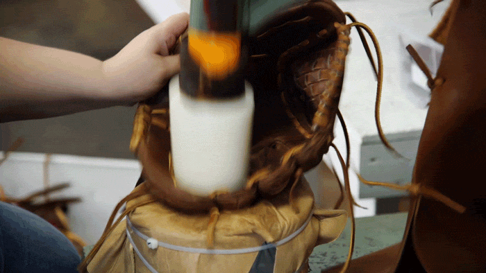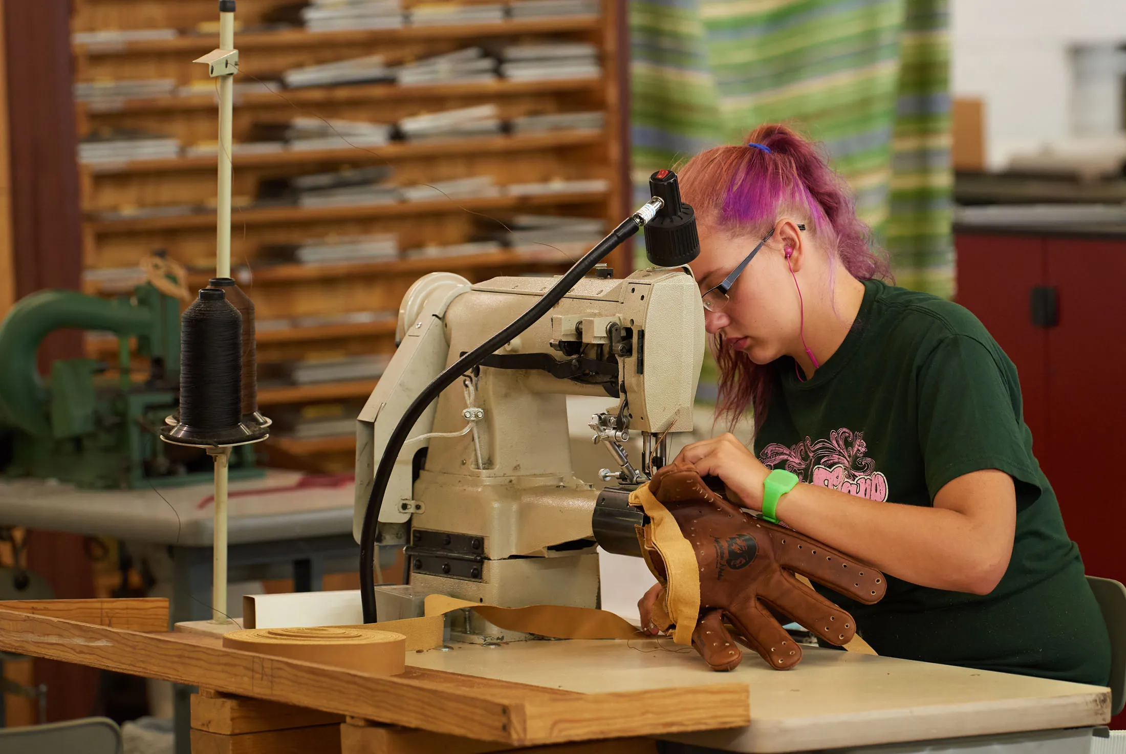 制作一副手套大约需要40个步骤,可能需要四个小时。皮革,主要来自芝加哥或密尔沃基,会被测试温度和厚度。工人将压机放在金属模具上切割皮革。这些部件——一些型号需要25个——被缝合在一起,连接内外两半。产品被翻转到正面,并在热钢指上塑形。在口袋下涂抹一种在二战期间用于清洁步枪的油脂,以保持其柔韧性。