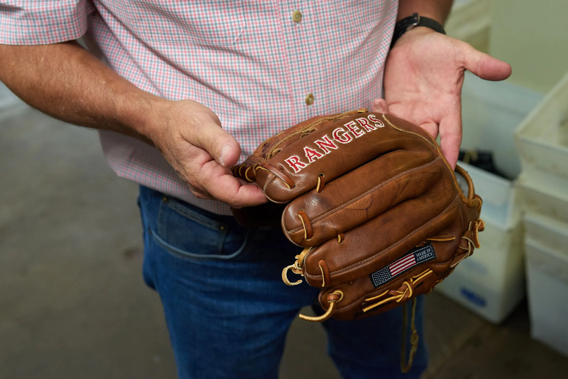 罗布·斯托里在德克萨斯州诺科纳的诺科纳制造厂手持一只为德克萨斯游骑兵队制作的手套。