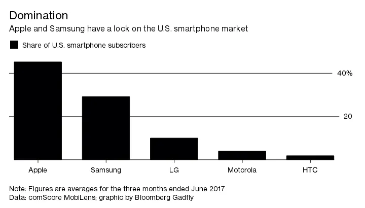 苹果和三星在美国智能手机市场的控制力难以打破 - 彭博社