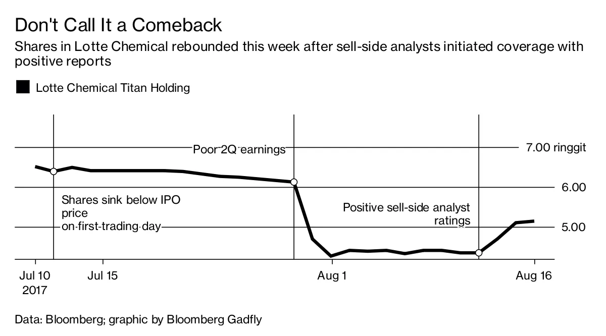 银行对Lotte集团塑料部门的乐观报告引发了周二股价上涨9%(截至周三午餐时间进一步上涨0.8%)。但所有的赞美都来自于承销此次发行的银行——摩根大通、马来亚银行、瑞士信贷集团和汇丰控股——而这仍然不足以扭转自7月上市以来股价下跌34%的局面。