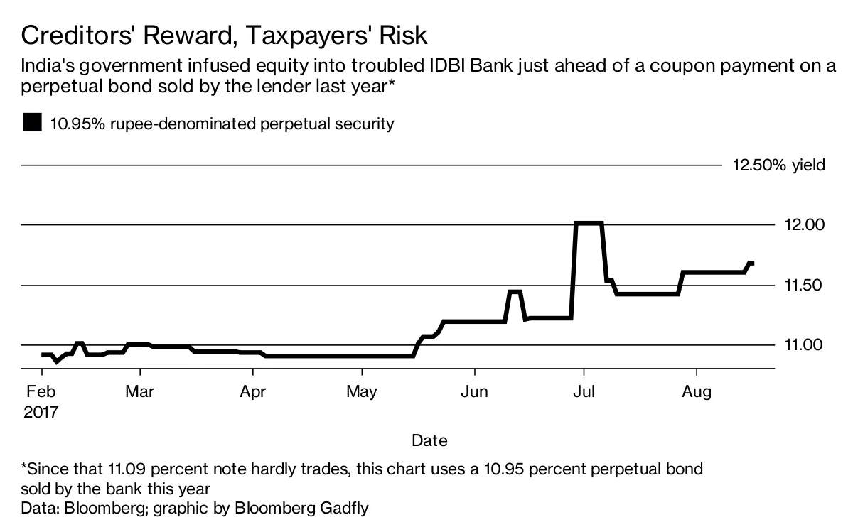 就在这个月,印度政府向IDBI注入了186亿卢比(2.9亿美元)的新股本,在这家总部位于孟买的贷款机构宣布6月份季度亏损85.3亿卢比和不良贷款激增至24.1%的总额之前五天,这是该国接受存款的机构中最高的。