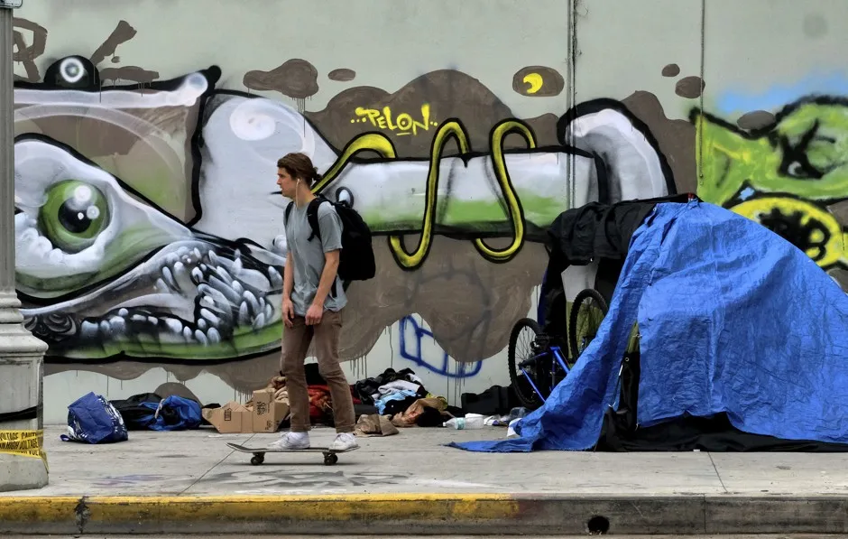 一名滑板手经过洛杉矶街道旁的无家可归者营地。理查德·沃戈尔/AP加利福尼亚正在萌芽的 YIMBY运动 正面临真正的考验。在本周批准的新试点项目下,洛杉矶县的房主被要求真正向无家可归者开放他们的后院。